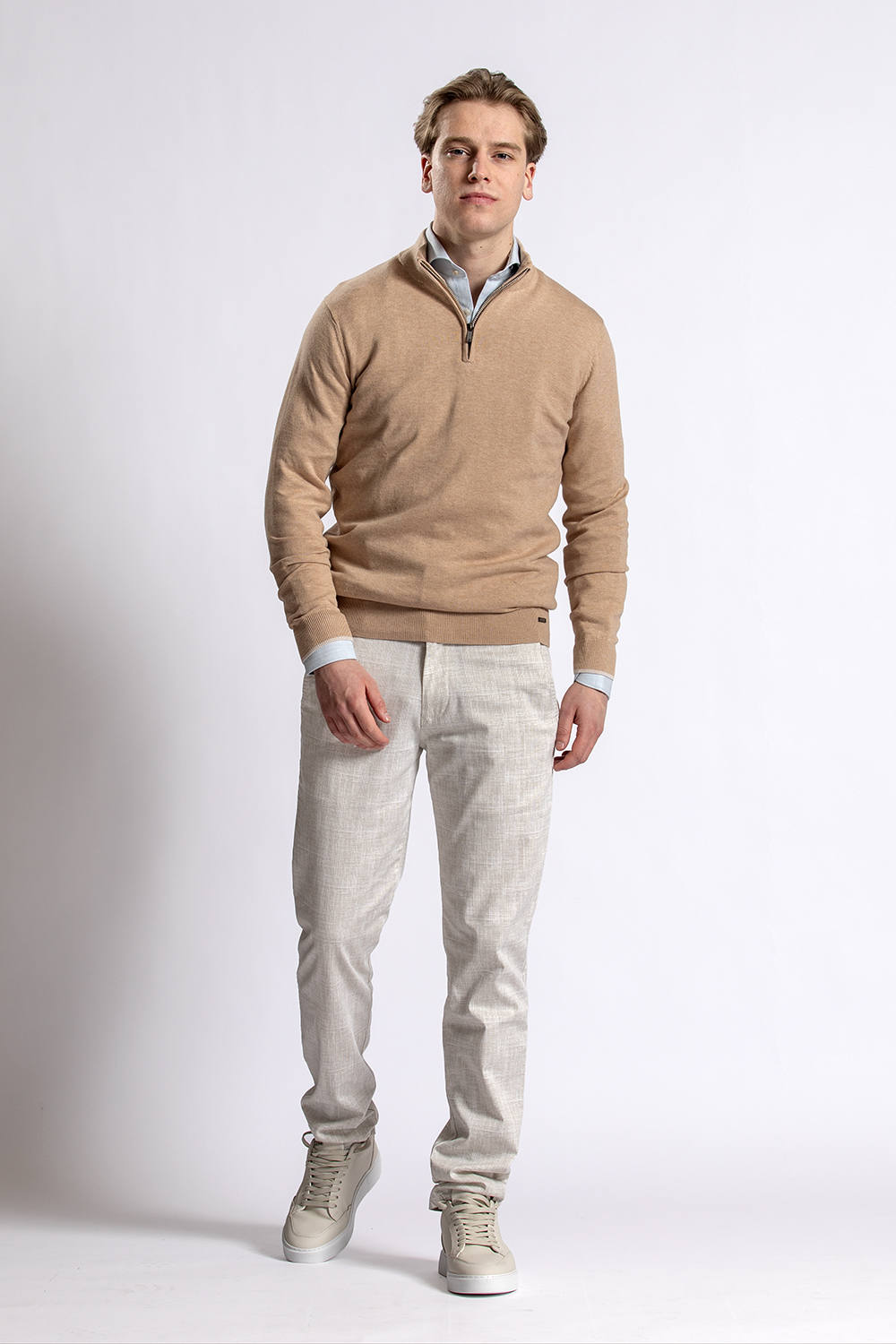 Leuke camel-kleurige katoen/zijde half zip trui met daaronder het lichtblauwe overhemd van John Miller en de geruite lichte zandkleurige chino…Lees meer Bekijk -