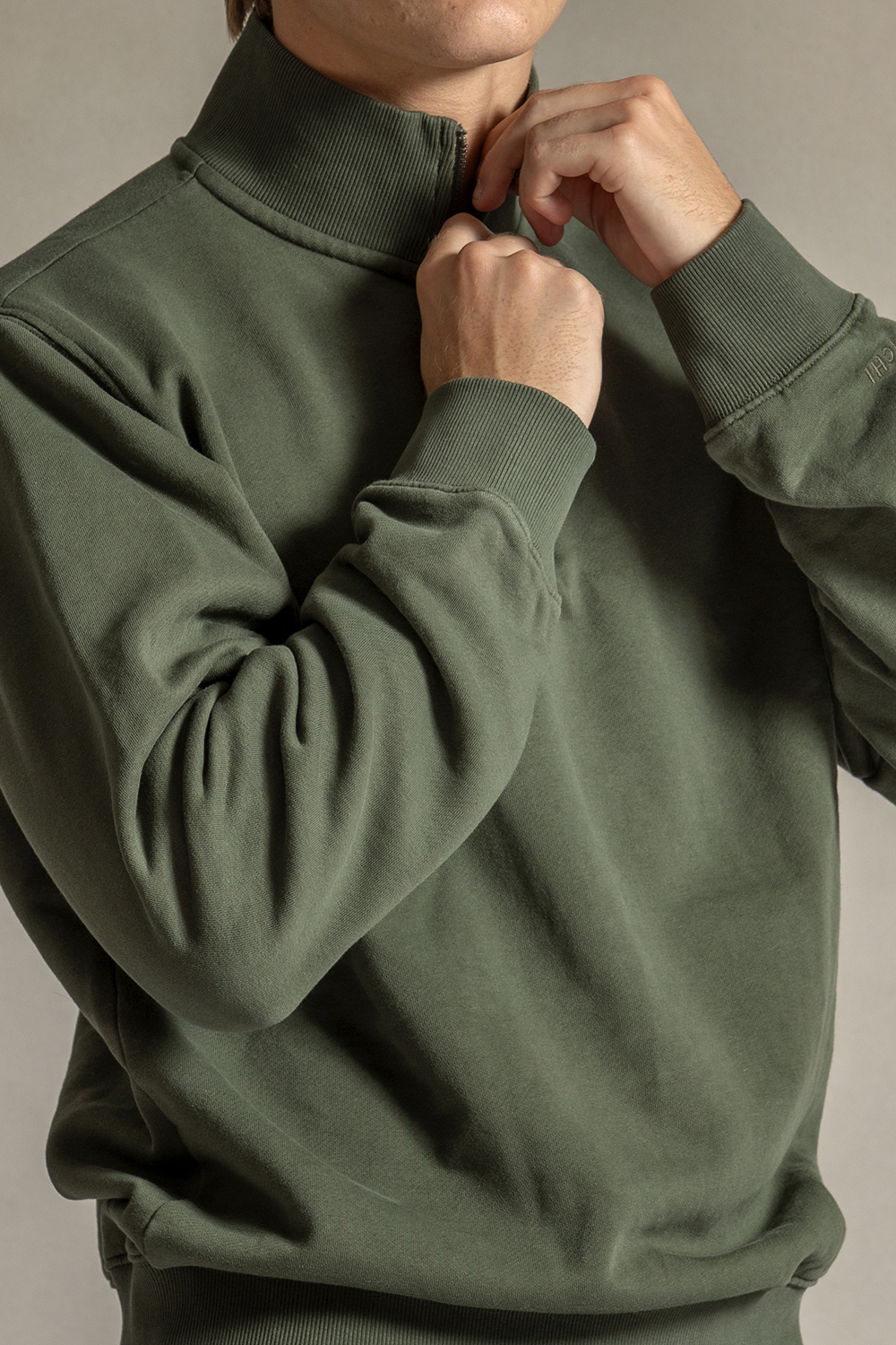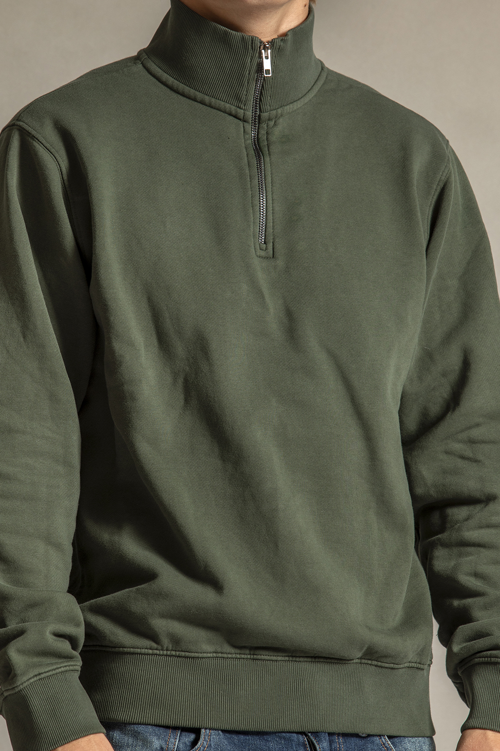 Weekend vibes met deze groene katoenen half-zip sweater en blauwe “Nick straight” jeans van Kuyichi.