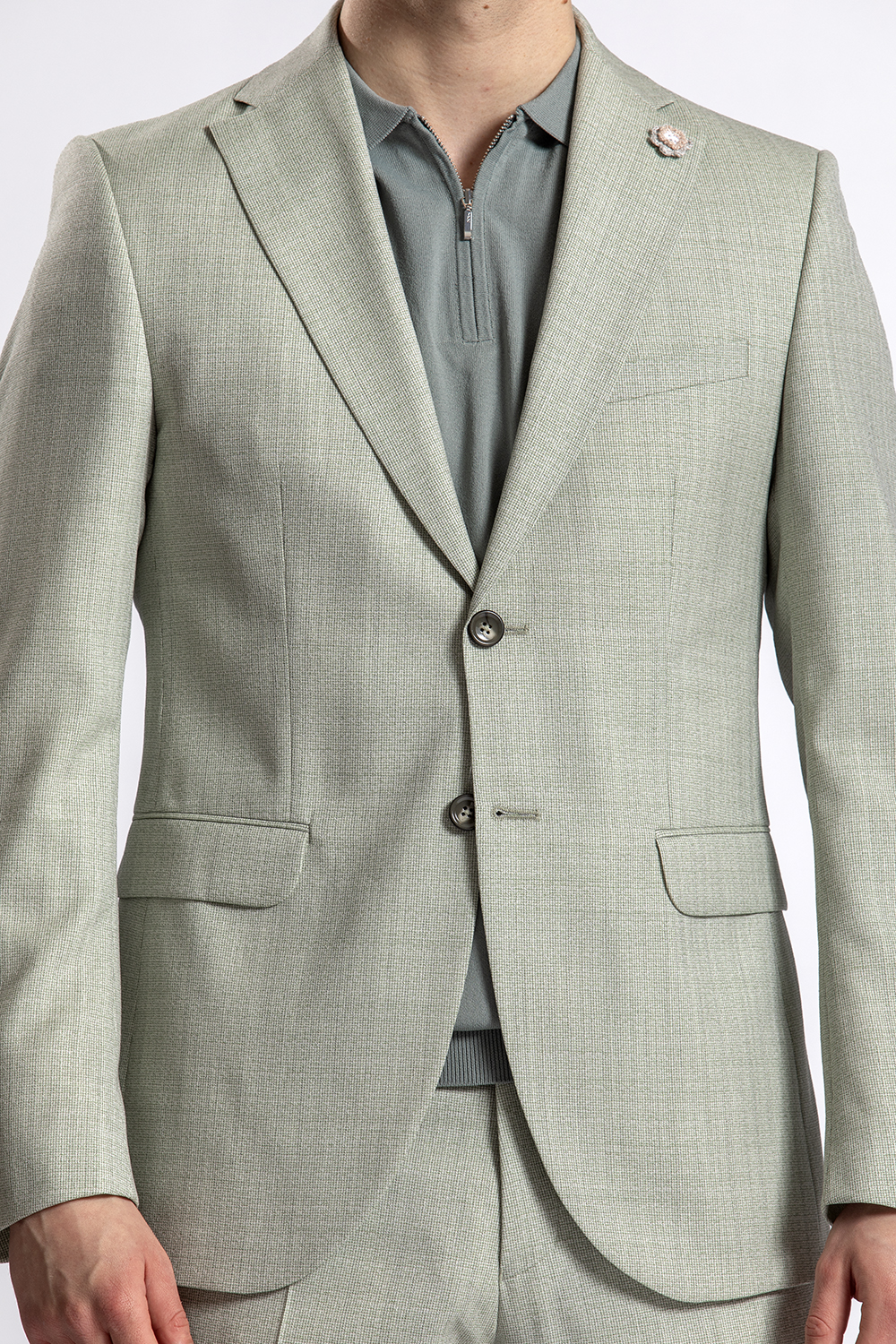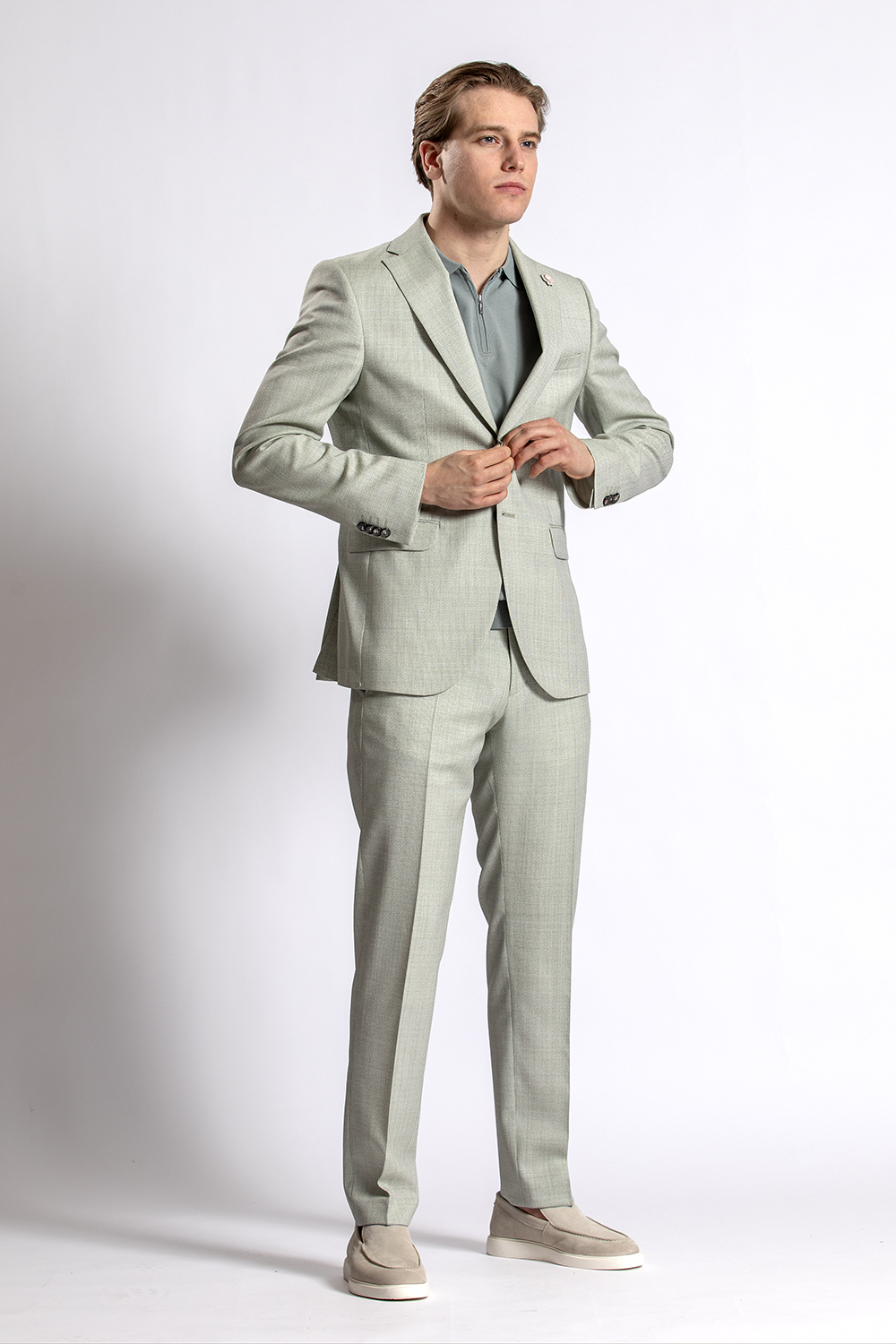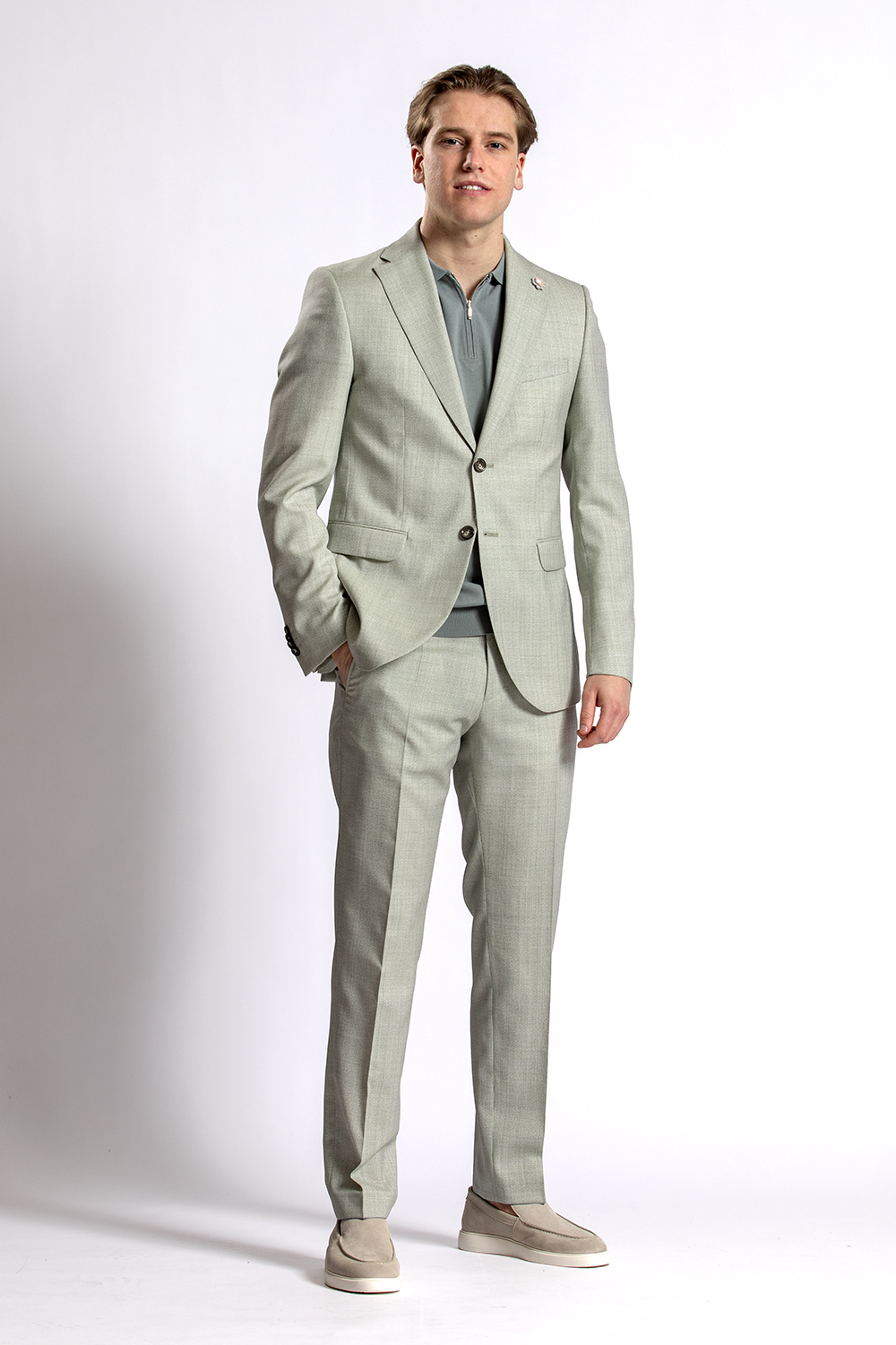 Draag het pak ook eens op een andere manier. Zoals dit 2 -delige groene pak met stof geweven door Marzotto en daaronder een cool dry polo van BWA. Het geeft het pak een sportieve en toch ook chique look. Een perfect pak voor zakelijk en feestelijk gebruik. Stijl het geheel af met de lichte suede loafers van Melik uit onze collectie.