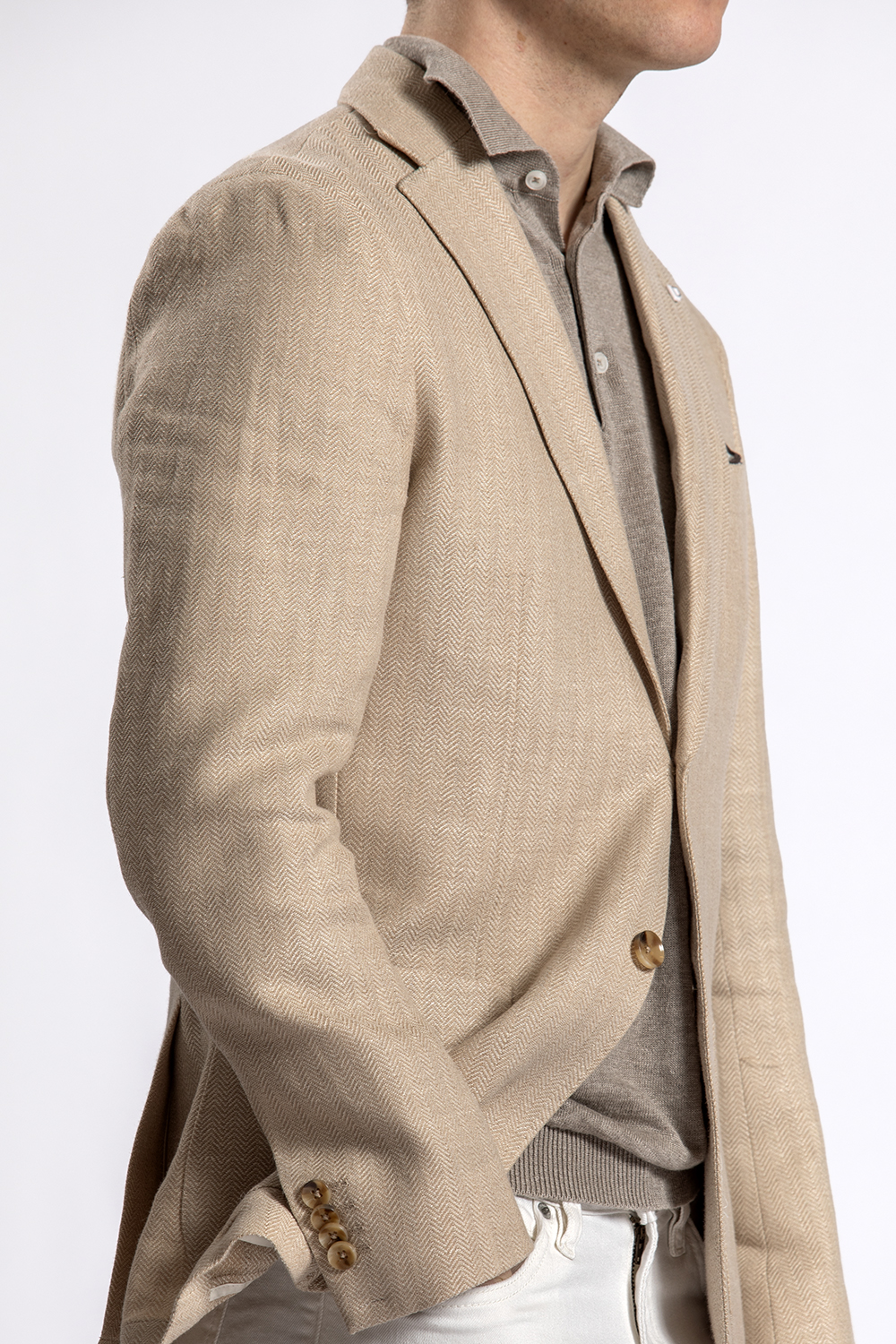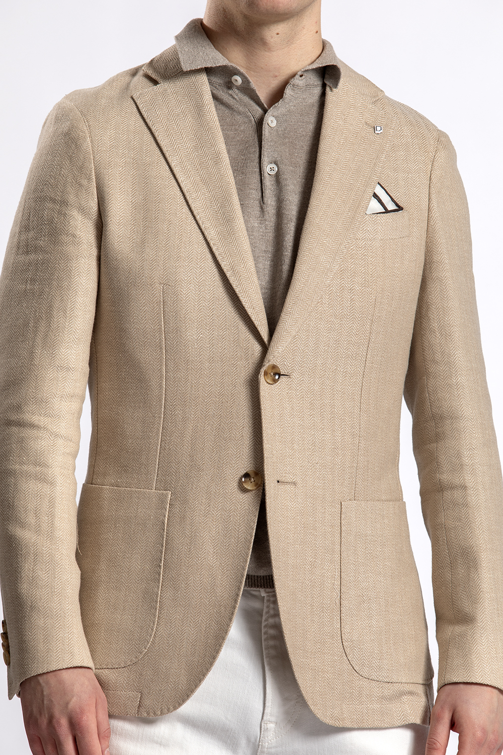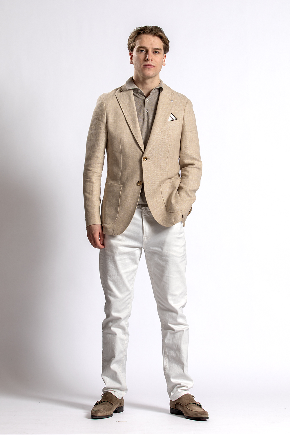 Look 34 Zandkleurig colbert BWA – linnen polo Gentiluomo – jeans Cast Iron