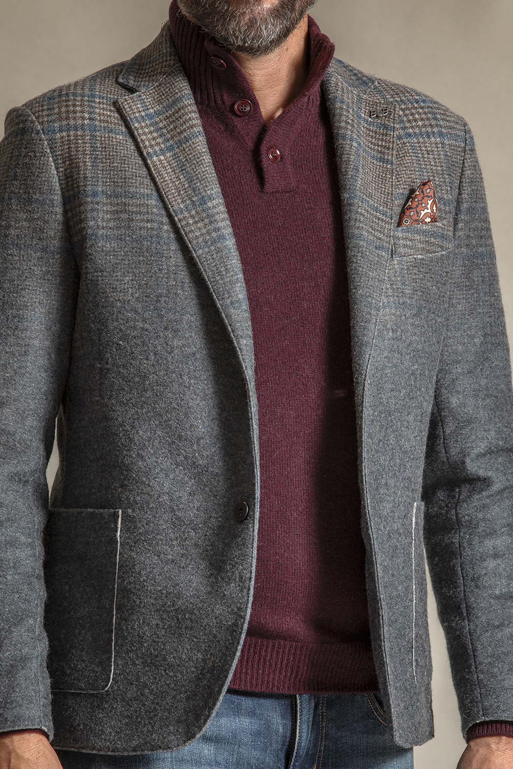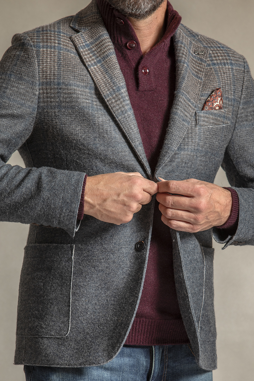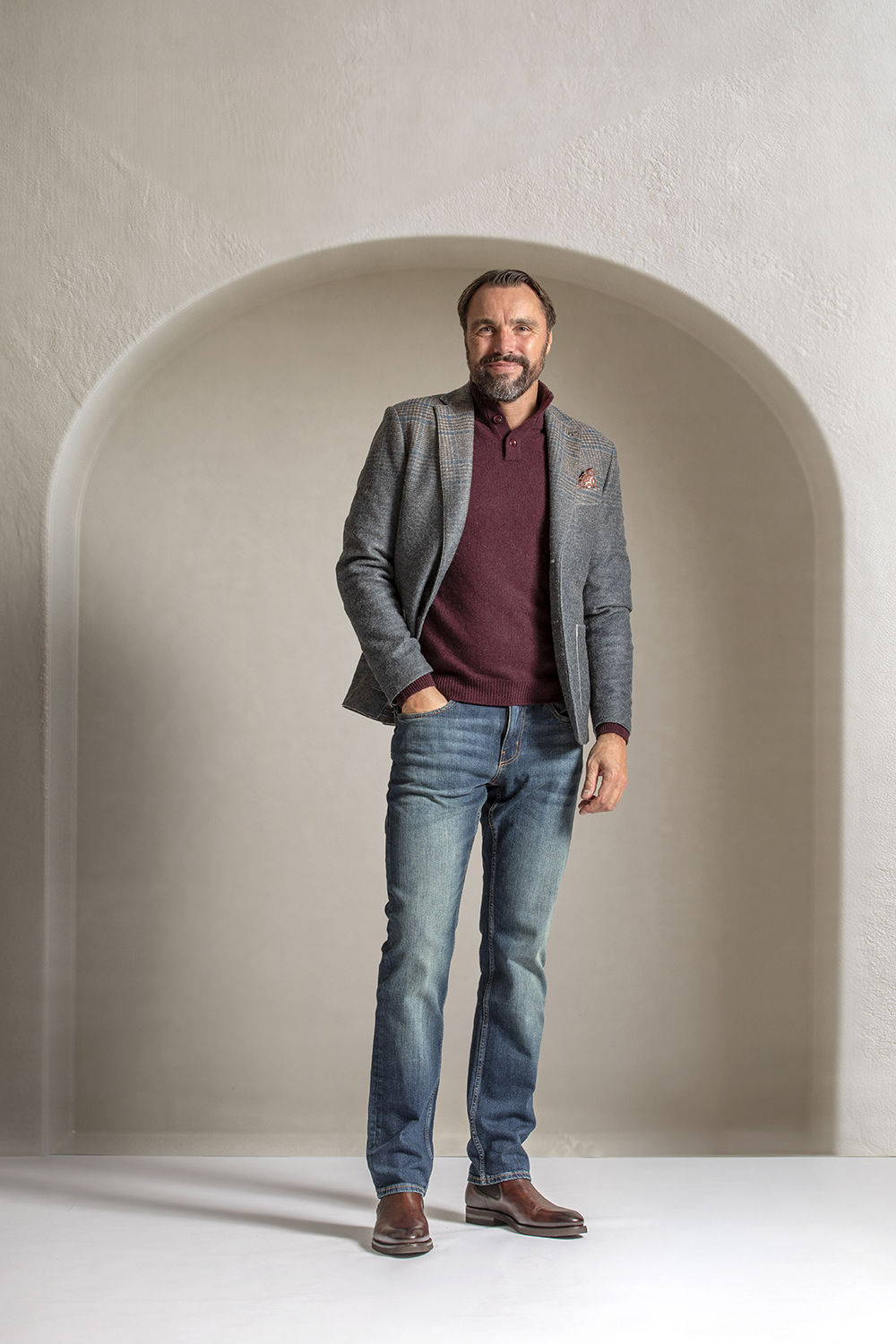 Gaaf colbert met verrassend dessin van het Italiaanse merk BOB. Daaronder zitten een bordeaux rode wollen trui van Wool & Co en de blauwe regular fit “Nick straight” jeans van Kuyichi.