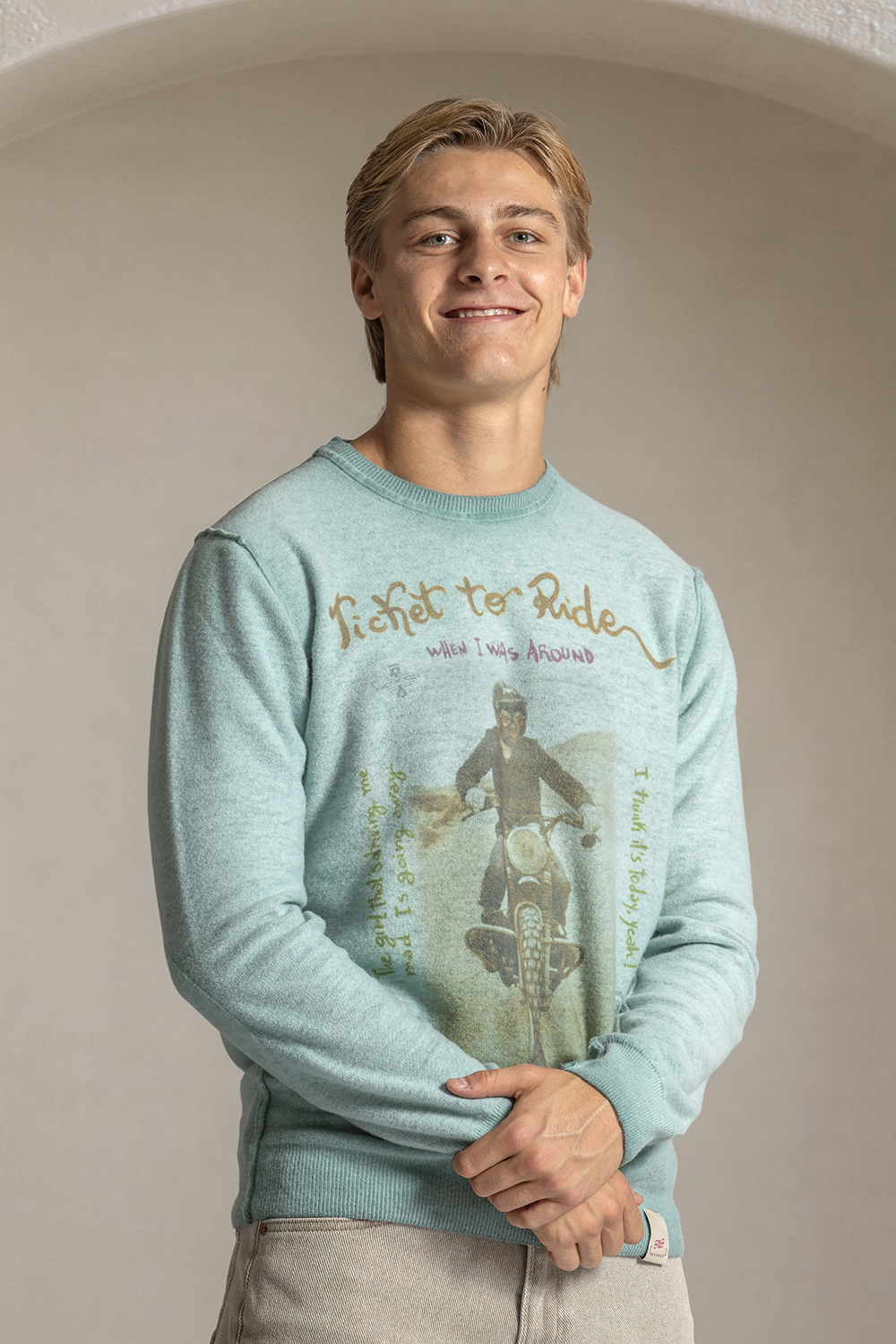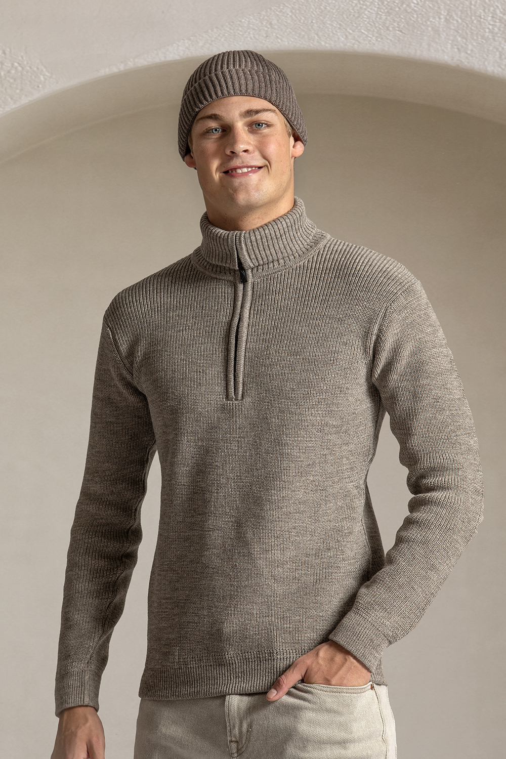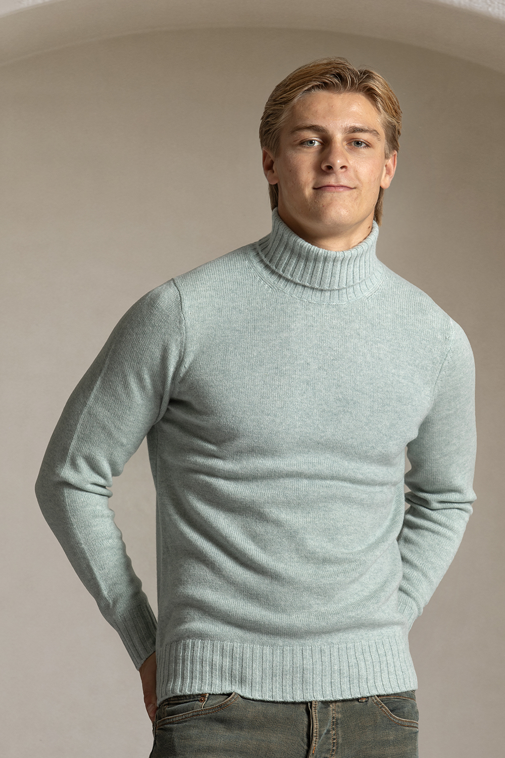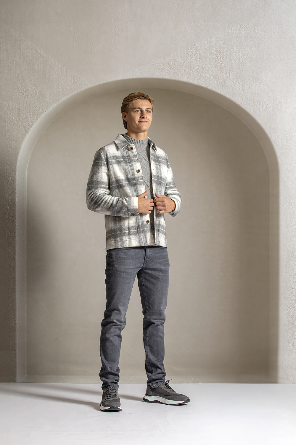 Gaaf colbert met verrassend dessin van het Italiaanse merk BOB. Daaronder zitten een bordeaux rode wollen trui van Wool & Co en de blauwe regular fit “Nick straight” jeans van Kuyichi.