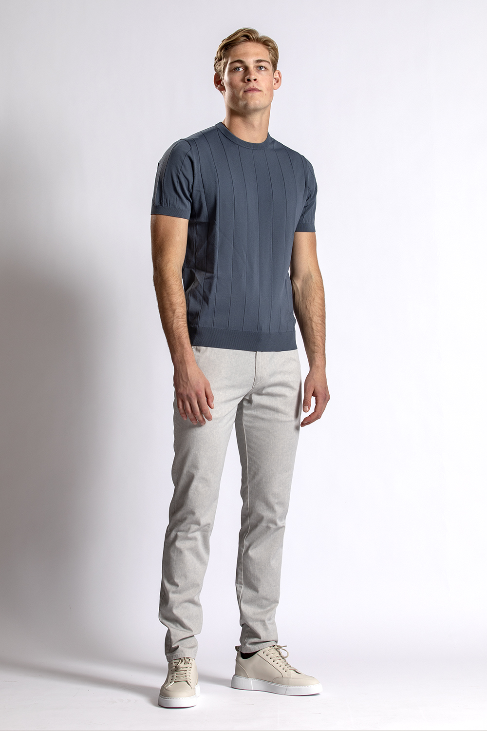 Zomerse look met dit staalblauwe cool dry t-shirt van I’m Fine met daaronder de lichte visgraat chino van het Zwolse North84 en de sneakers van H32.