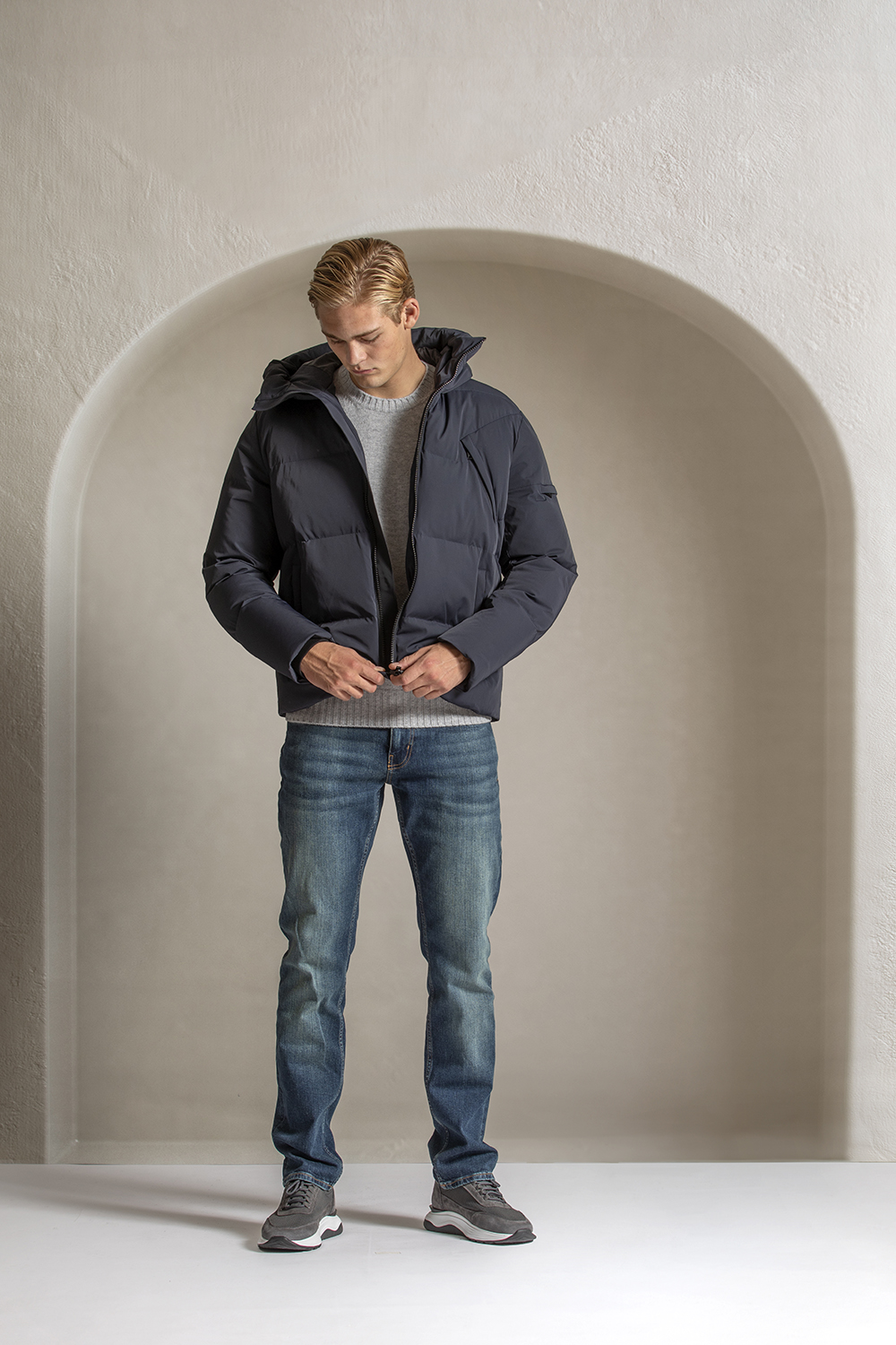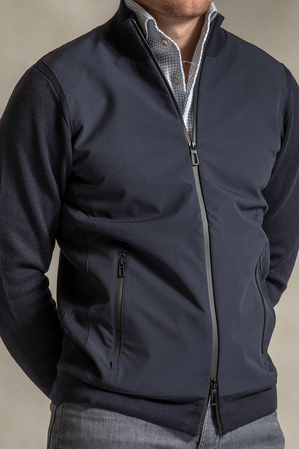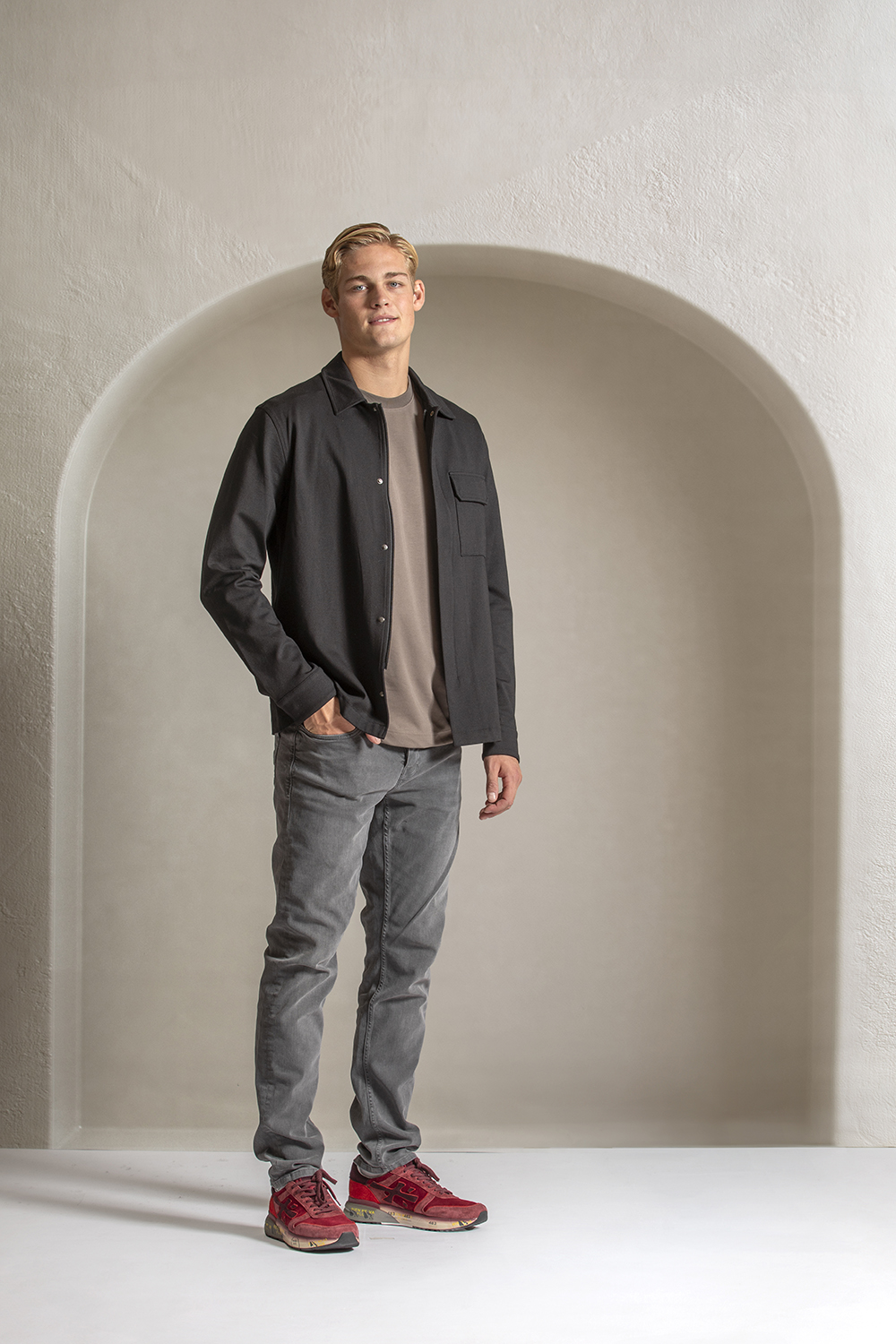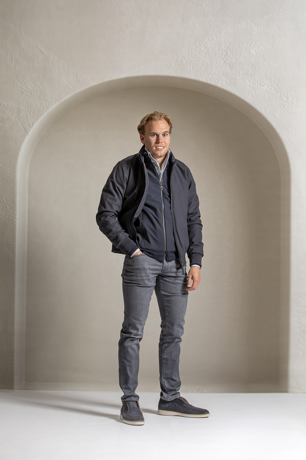 Gaaf colbert met verrassend dessin van het Italiaanse merk BOB. Daaronder zitten een bordeaux rode wollen trui van Wool & Co en de blauwe regular fit “Nick straight” jeans van Kuyichi.