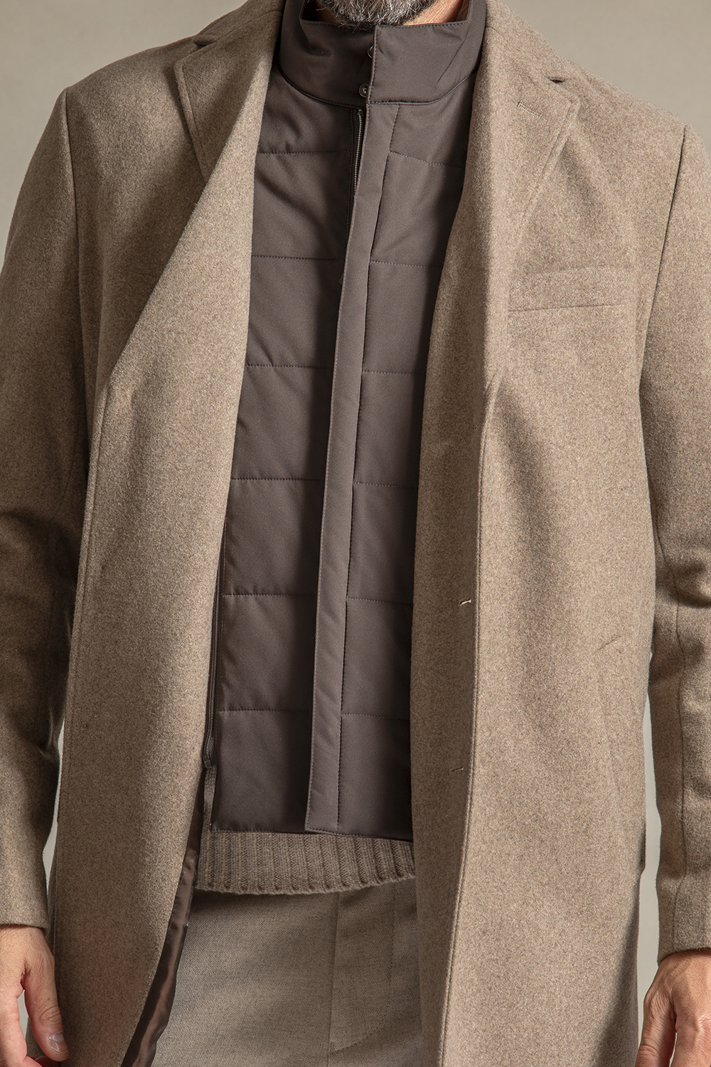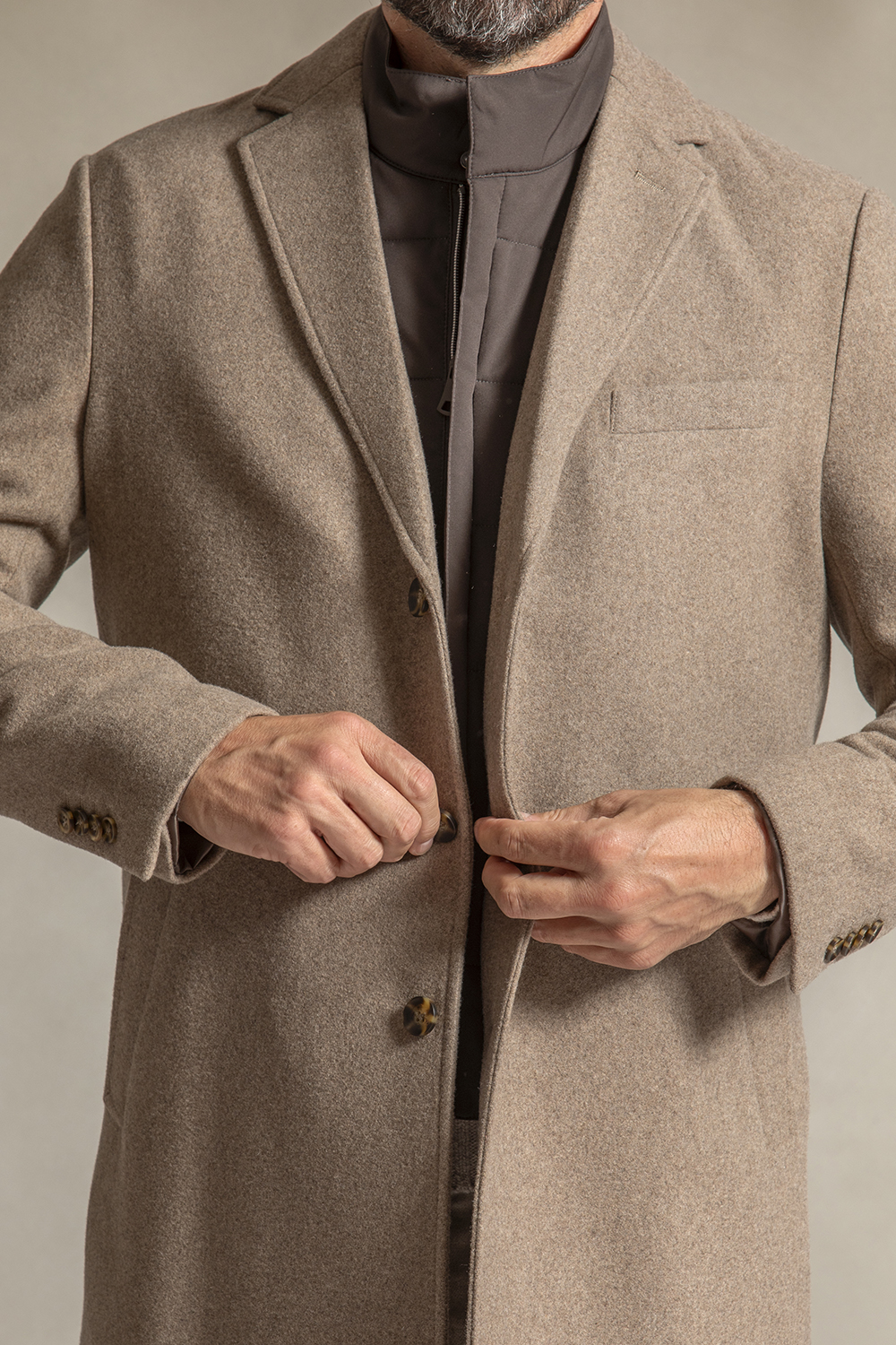 Mooi zandkleurig flanel pak van Drykorn met daaroverheen een mooi camel-kleurige mantel met uitneembare inlay van BWA. De halfhoge boots zijn van Melik en die verkopen wij ook.