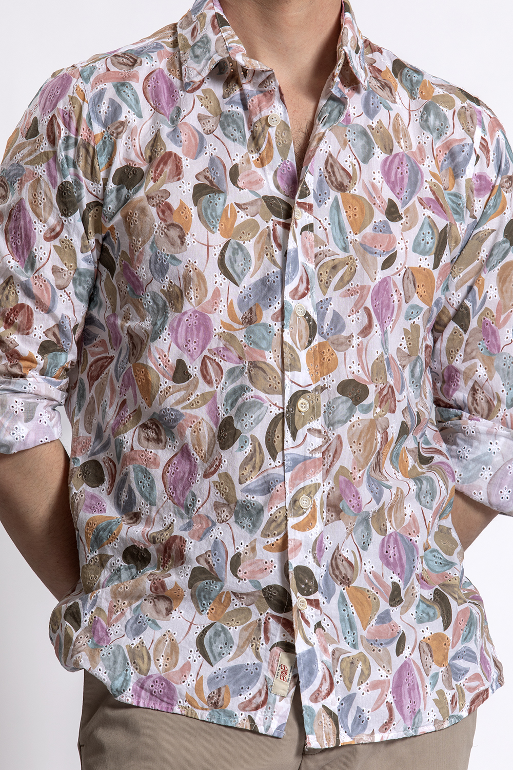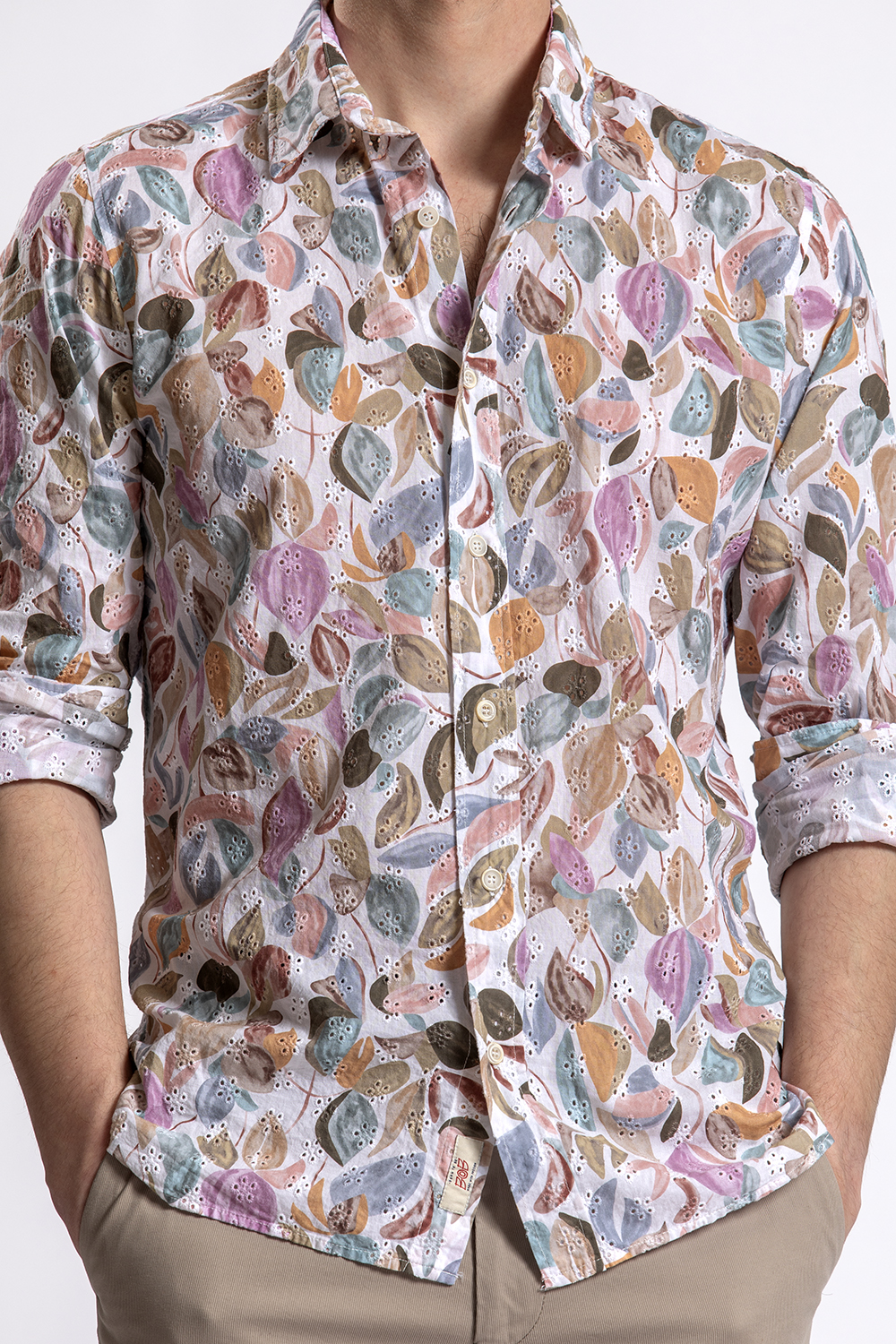 Leuke zomerse set voor naar het werk, de vrije tijd of naar een feestelijke gelegenheid. Dit kleurrijke shirt van het Italiaanse merk BOB met daaronder de wat wijdere chino van Drykorn en de suede loafers van Melik.