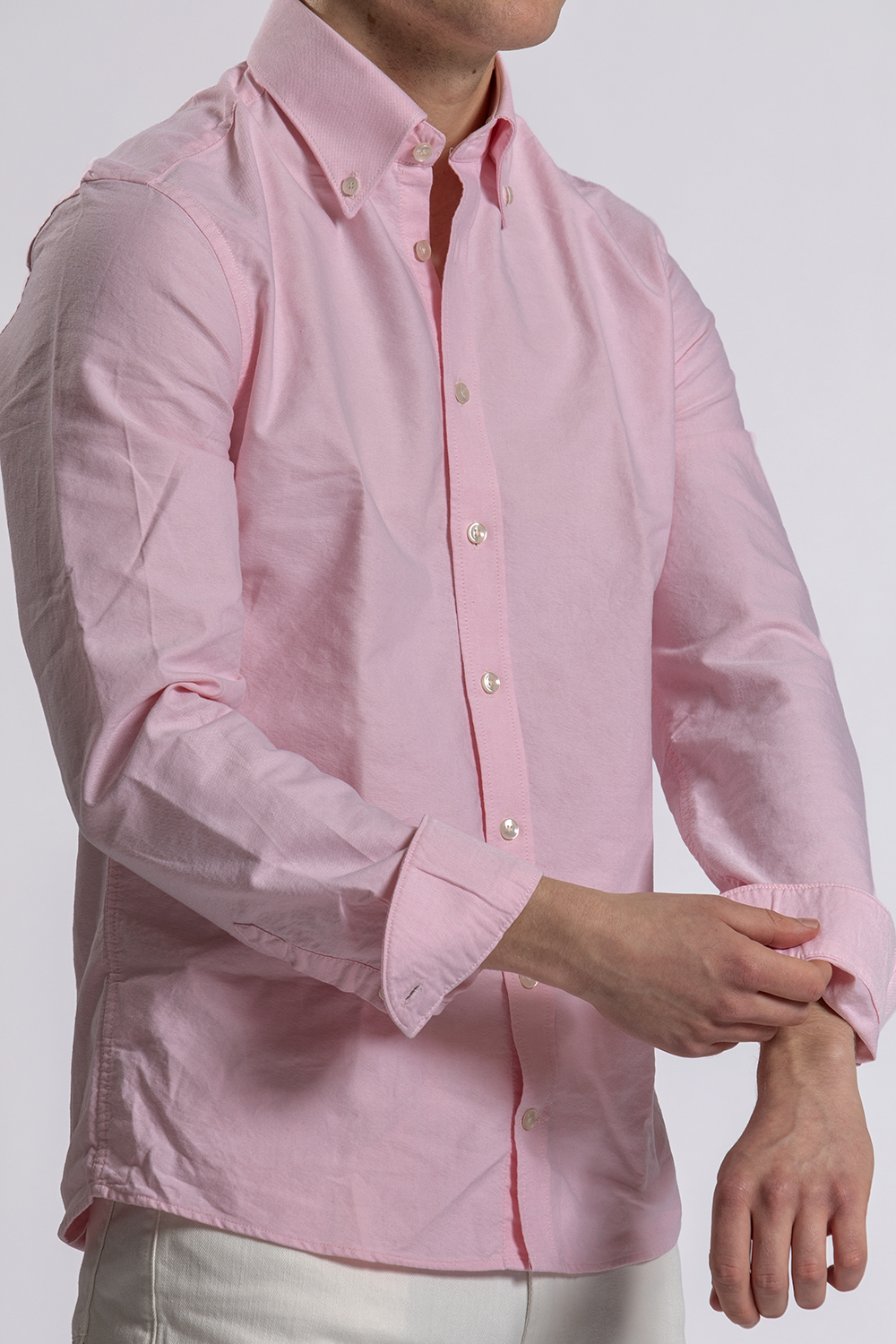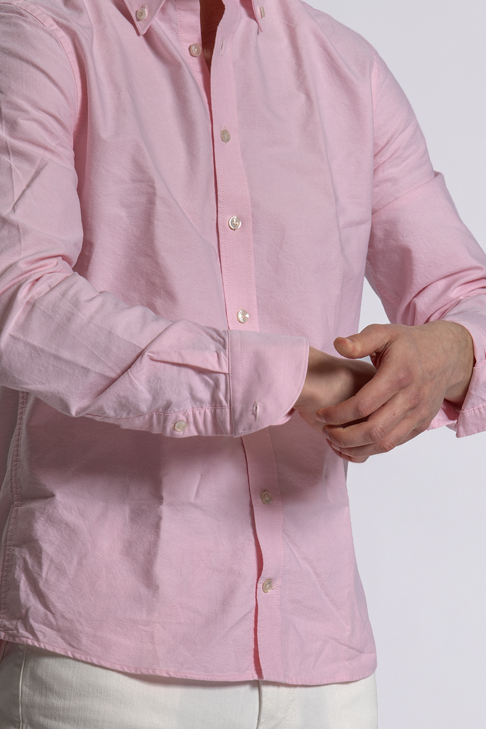 Zomerse kleurrijke set met dit roze button down shirt van John Miller, de witte regular fit Valver jeans van Cast Iron en de bruine bootschoenen van het Spaanse Abarca.
