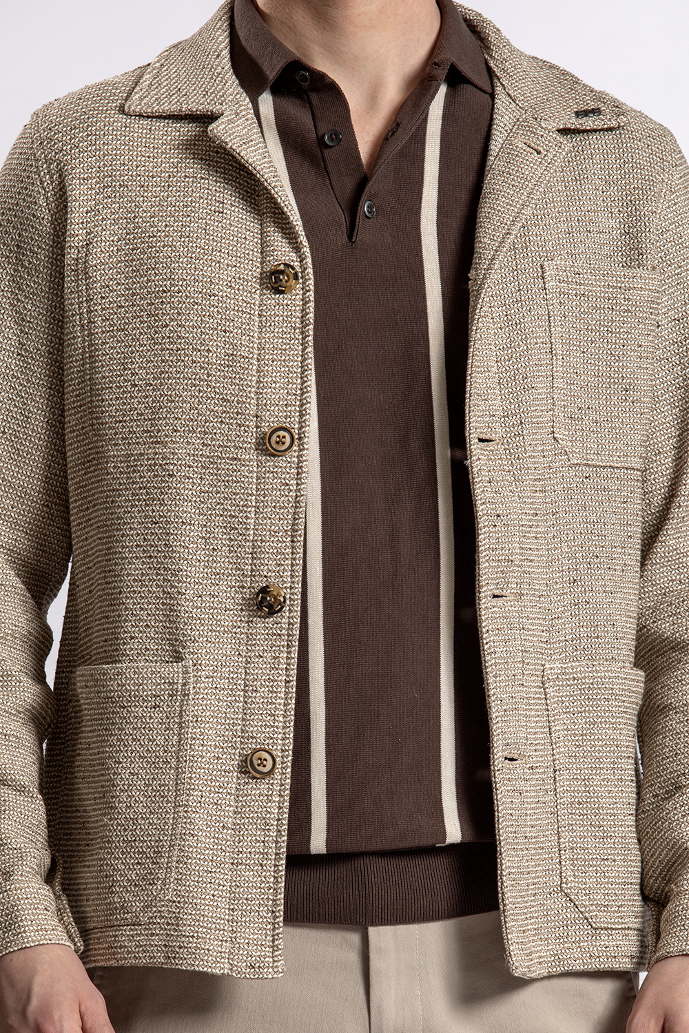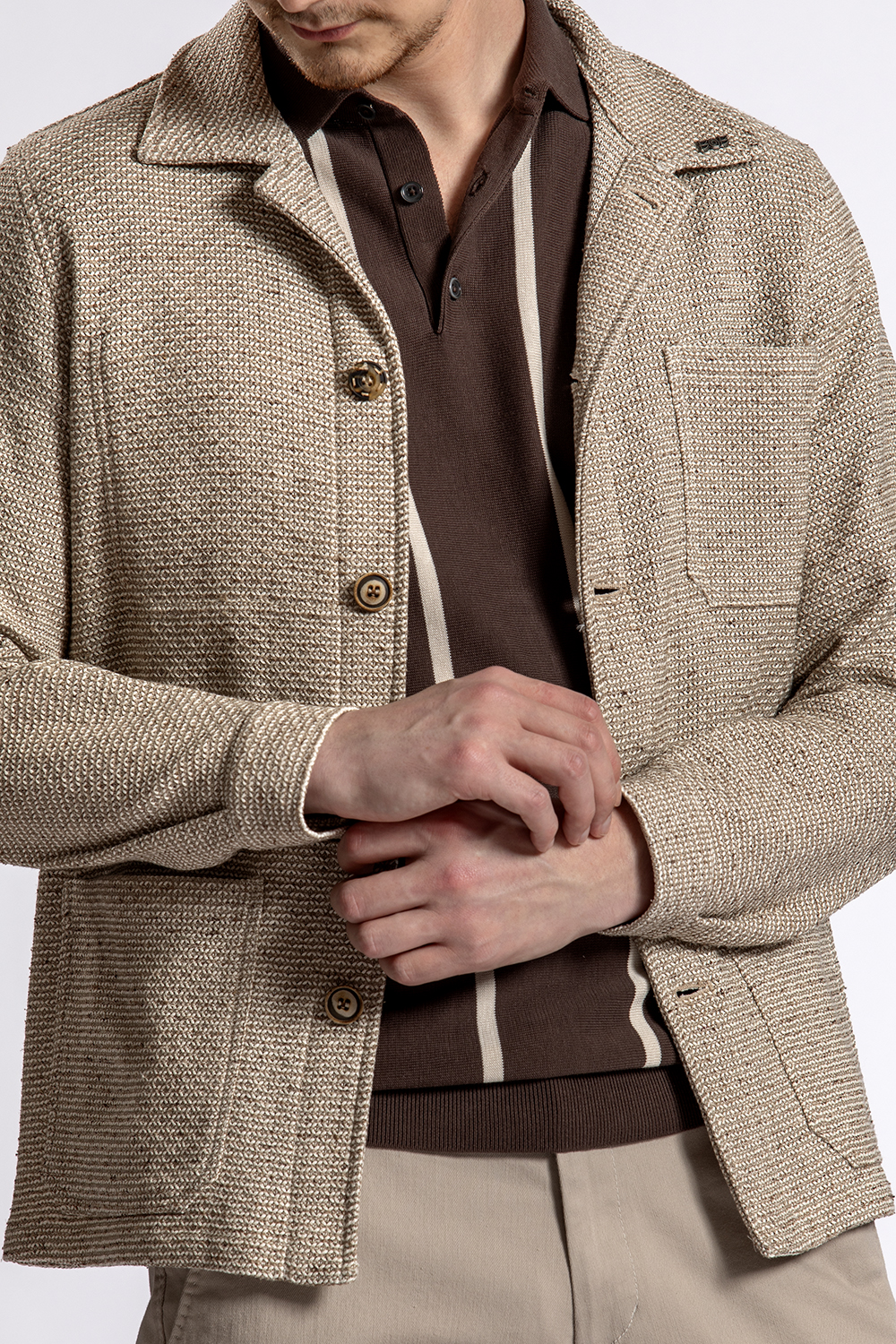 Leuke smart casual, summer chique set voor in de vrije tijd of naar het werk. Dit zandkleurige overshirt van BOB met daaronder de gebreide bruin/wit gestreepte polo en zandkleurige chino van North84. Stijl het geheel af met deze leuke bruine bootschoenen van Abarca uit onze collectie.
