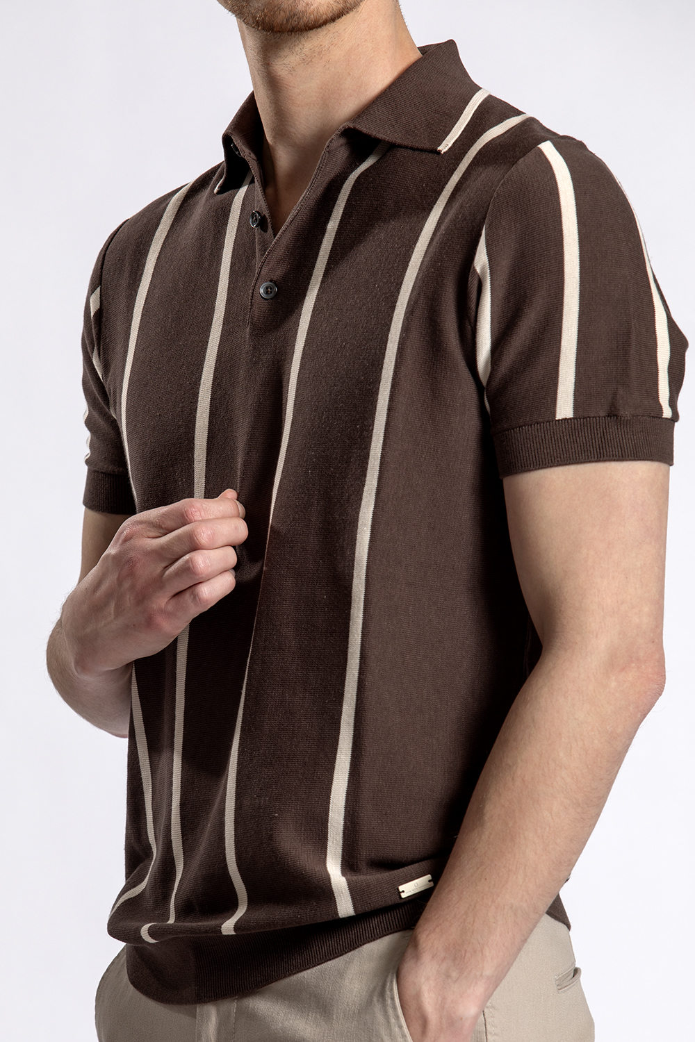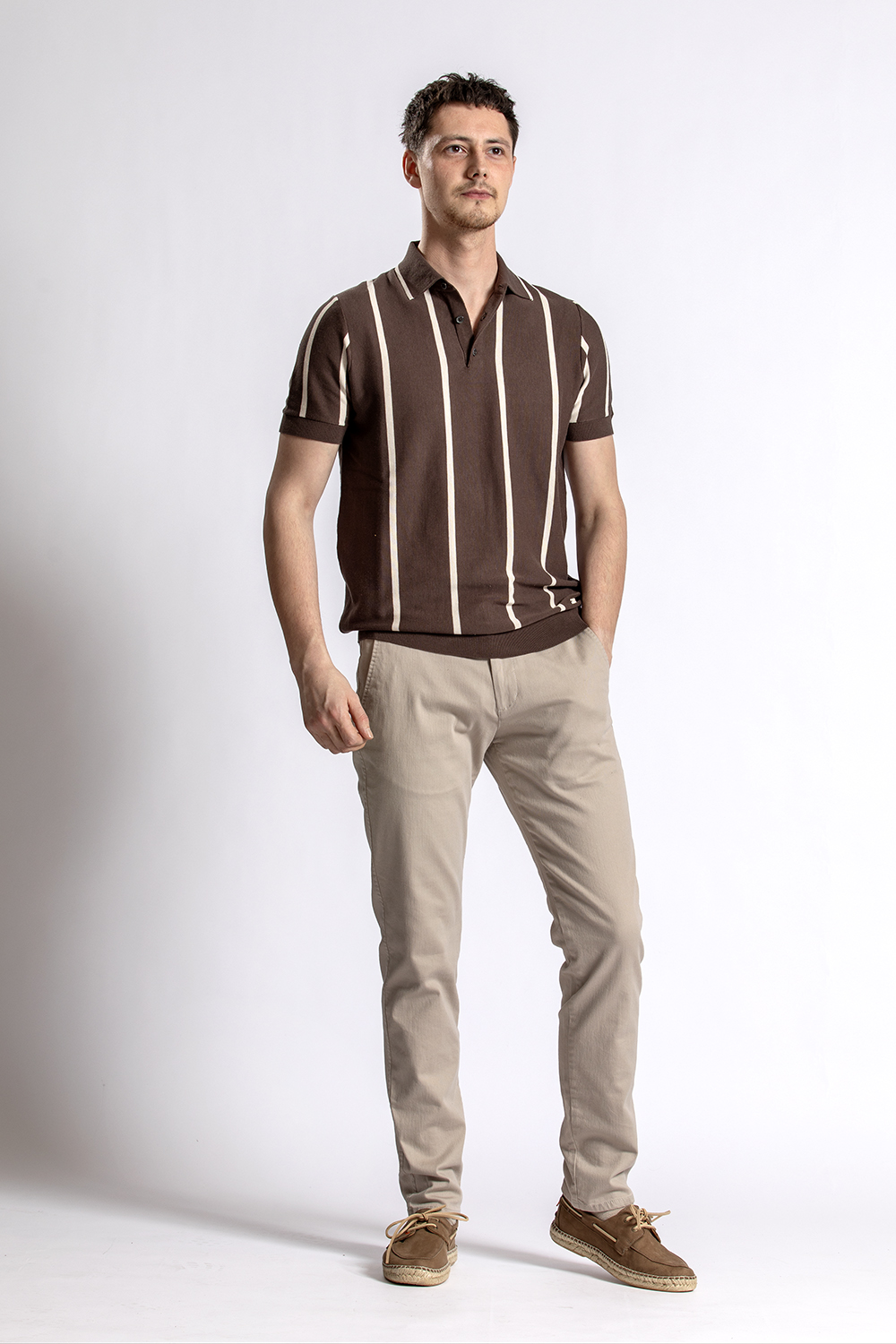 Leuke bruin/wit gestreepte gebreide polo van BWA met daaronder de zandkleurige North84 chino en de bruine bootschoenen van het Spaanse Abarca.