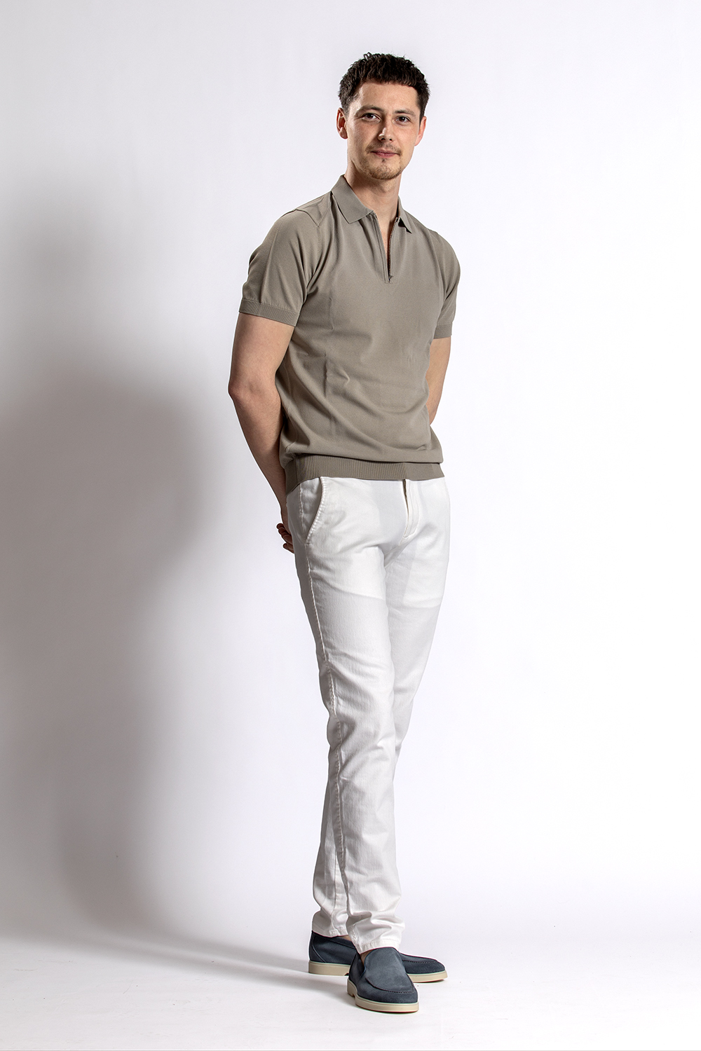Stijlvolle cool dry polo met rits van I’m Fine met daaronder de witte chino van North84.