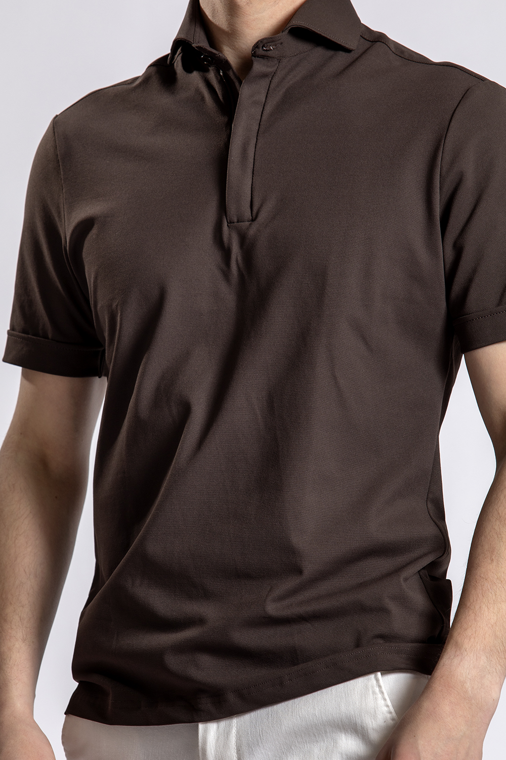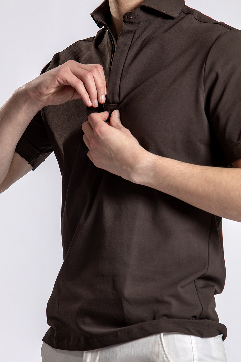 Super comfortable donkerbruine hyperstretch polo van John Miller met daaronder de witte katoenen chino van het Zwolse merk North84.