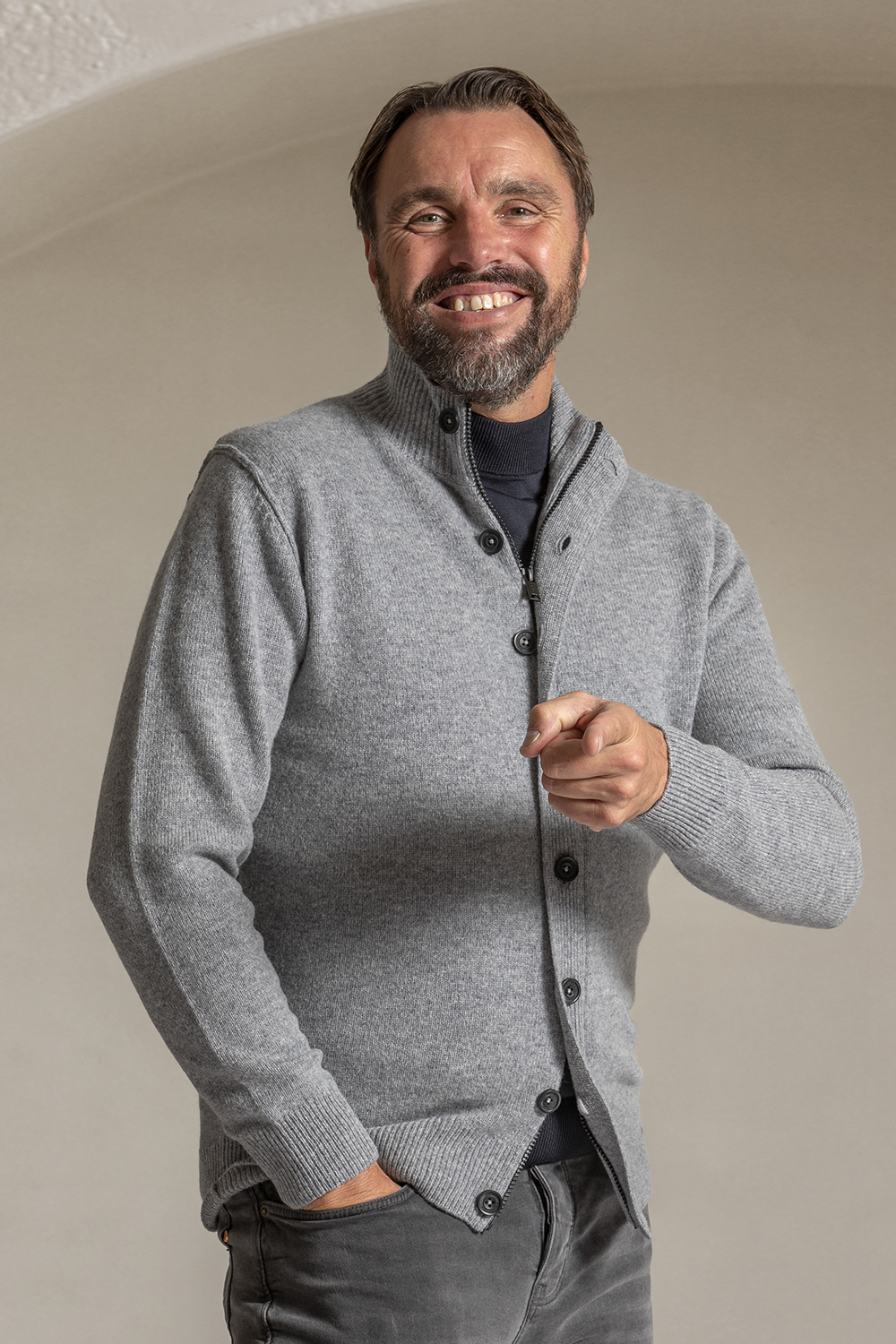 Mooi lichtgrijs wollen vest van Genti met daaronder een donkerblauwe “cool dry” turtle-neck trui van BWA.