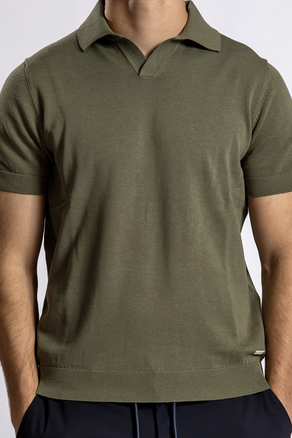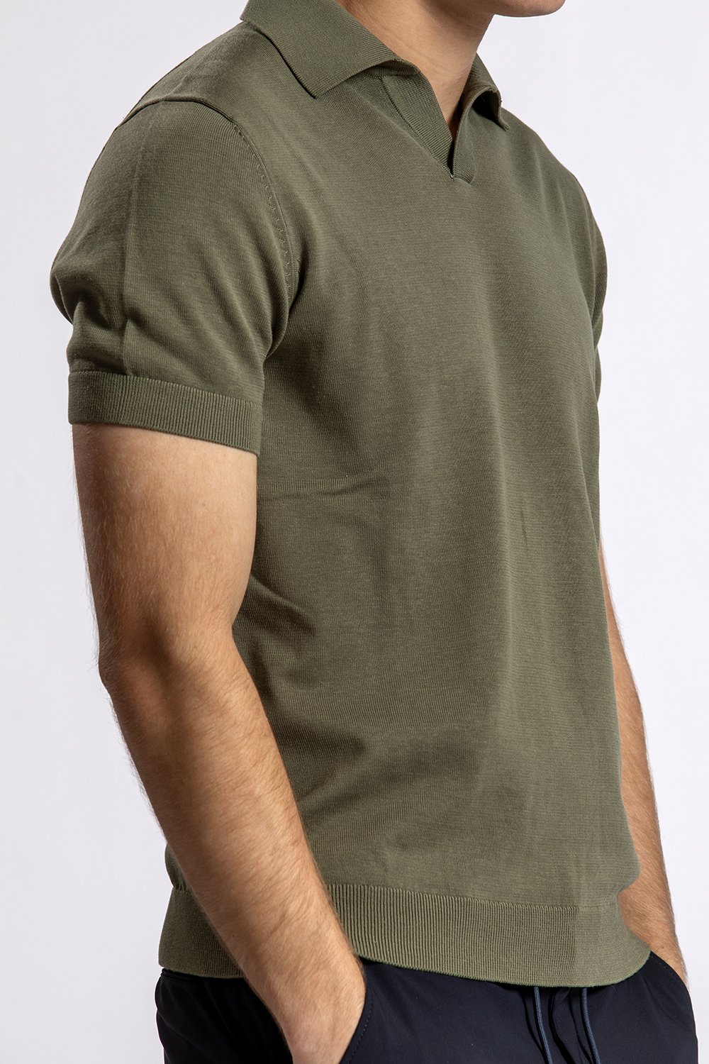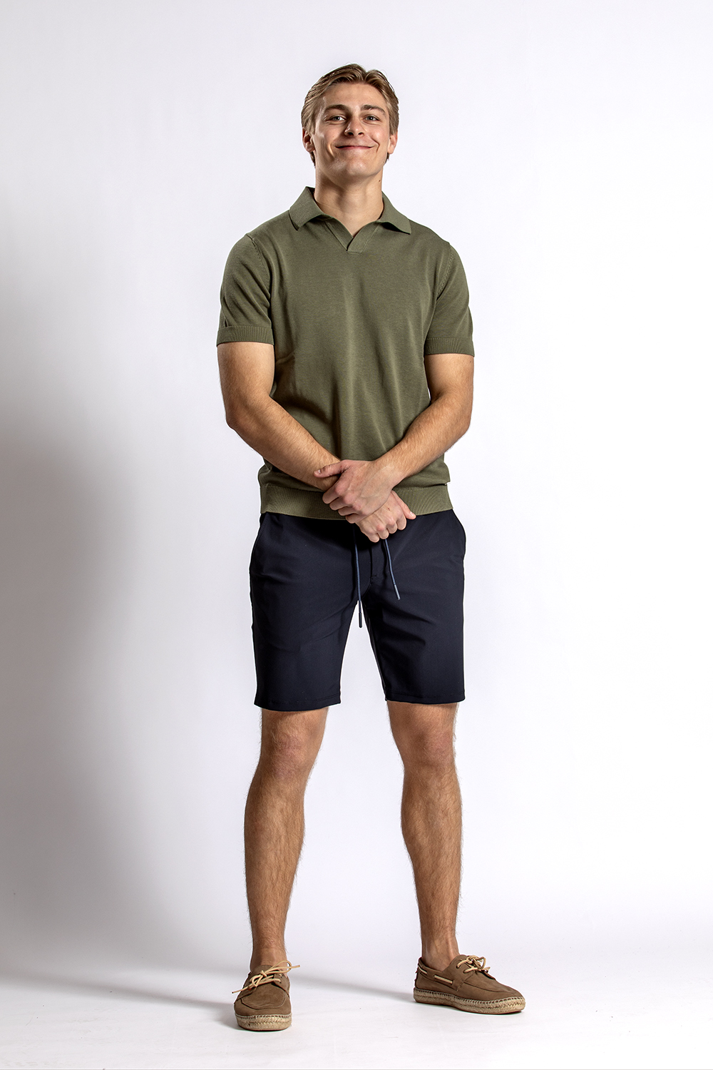 Mooie groene gebreide katoen/linnen/zijde polo van BWA met daaronder de donkerblauwe travelshort van North84 en de bruine bootschoenen van Abarca.
