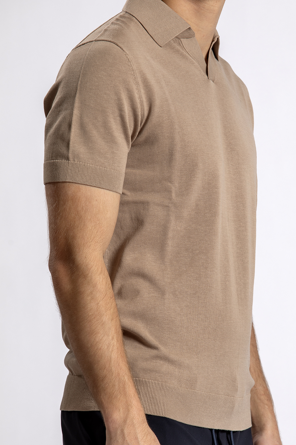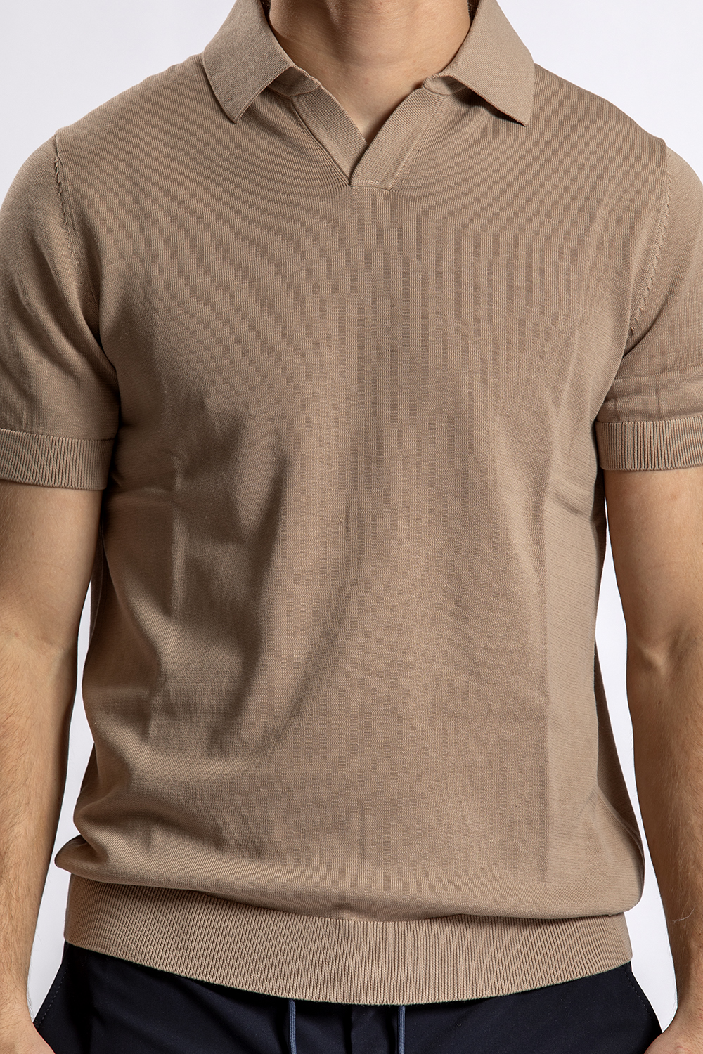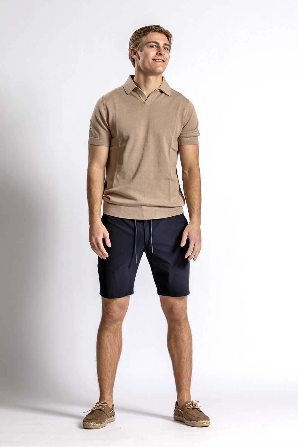 Zandkleurige gebreide polo van BWA met daaronder de donkerblauwe travelshort van North84 en de bruine bootschoenen van Abarca.