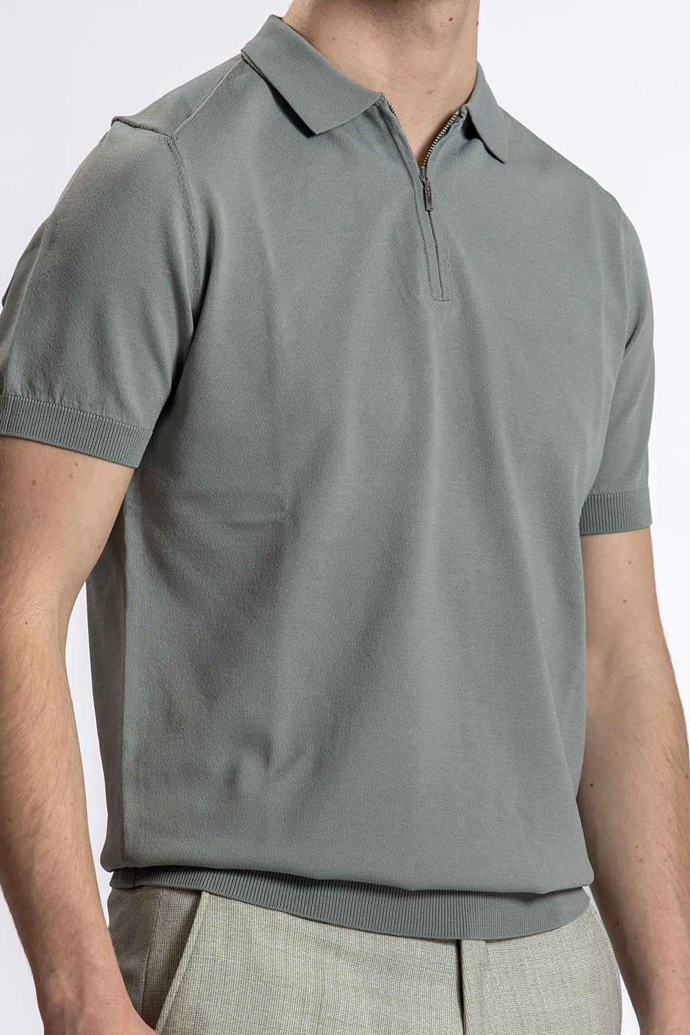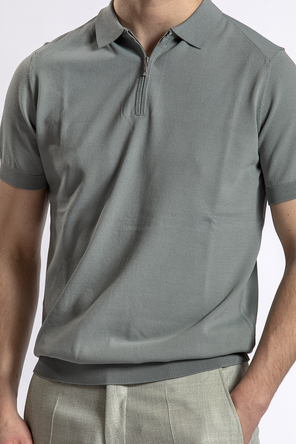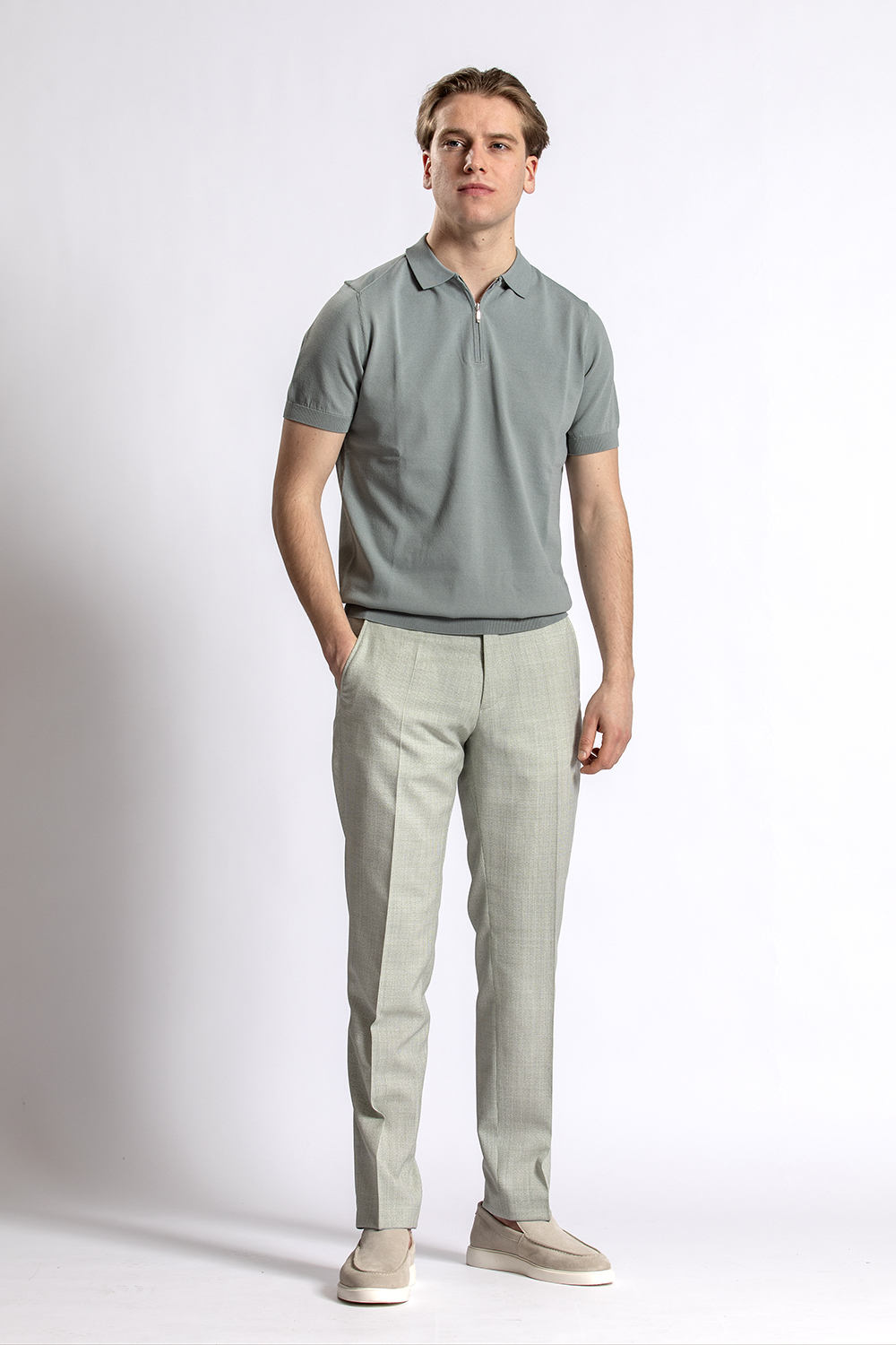 Mooie mintgroene cool dry polo met ritsje. De pantalon is een deel van een pak. Stijl het geheel af met de suede loafers van Melik.