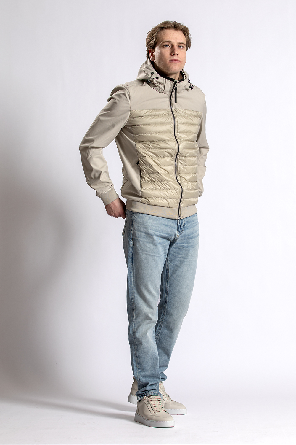 Mooi kit-kleurig jack met afneembare capuchon van Reset met daaronder het gebreide donkerblauwe t-shirt van BWA en de regular fit…