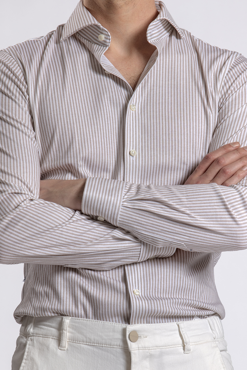 Mooi wit/zandkleurig 100% katoenen gestreept stretchshirt van Desoto. Stijlvol en comfortabel!
